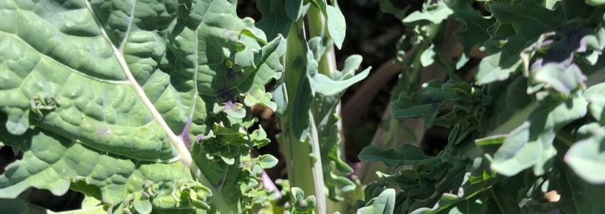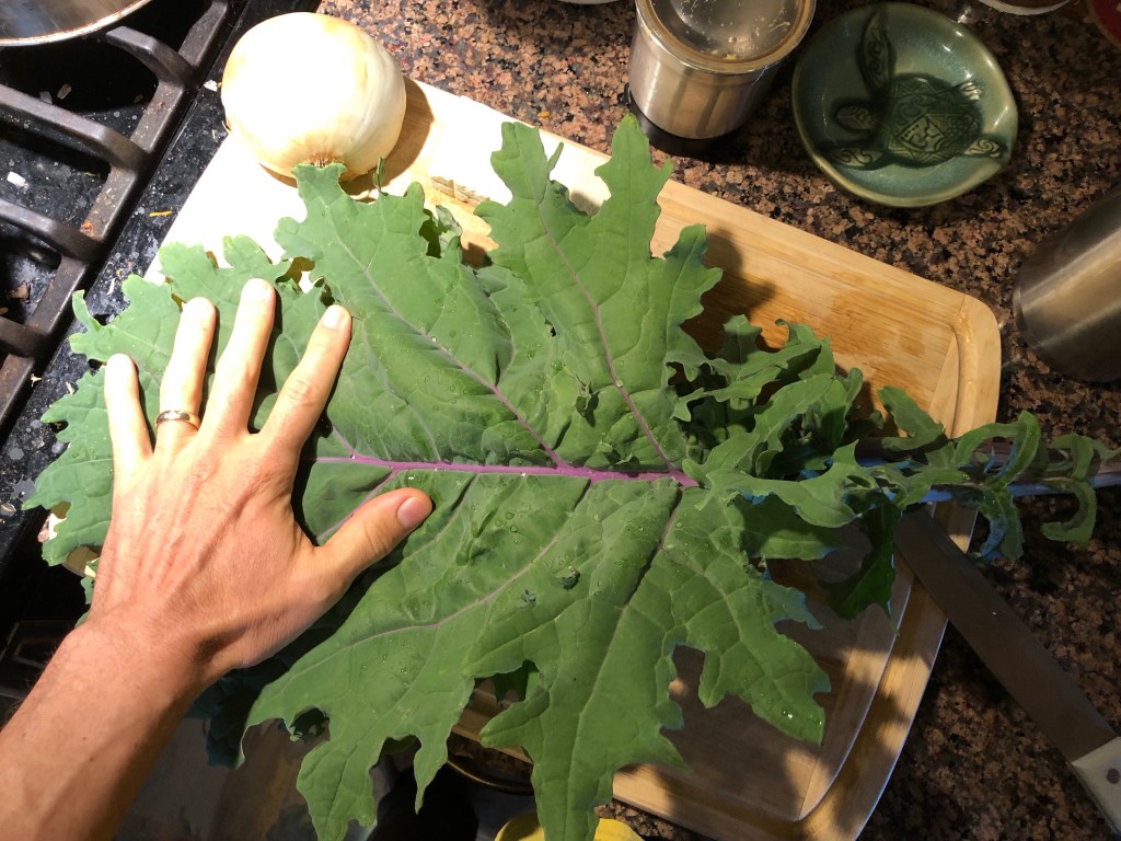 The kale had gotten mature enough to harvest about a month ago. I picked some today for lunch and holy cow, the leaves were enormous! It’s the biggest kale I’ve ever grown. Maybe some of the biggest ever grown for the variety?