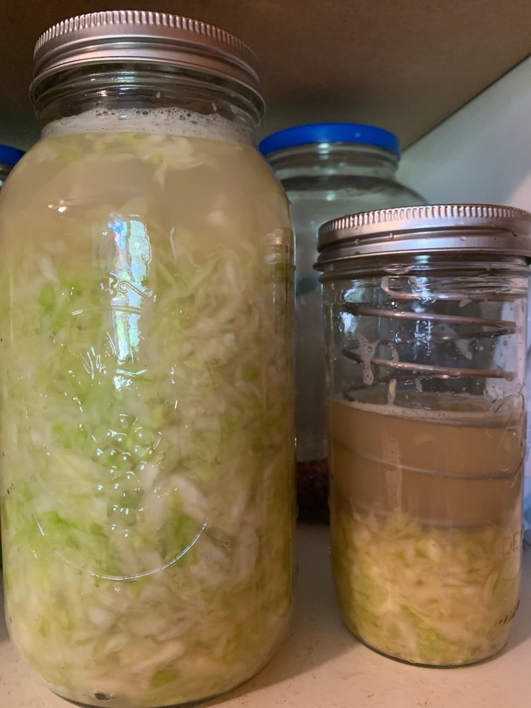 A quick internet search about sauerkraut and the sealing process. Son of a gun! Most store sold sauerkraut is pasteurized and thus killing off all the bacteria! Grrrrr….. I’ve been eating all this pickled cabbage without getting the benefit of the bacteria! The things you don’t know about until you do a little digging (or thinking).